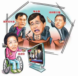 昨天在法庭上檢察官和律師激烈爭(zhēng)辯后,陳水扁以不可能拋下吳淑珍逃亡為由,哽咽要求法官別再押他。吳淑珍則透過(guò)電視關(guān)心陳水扁出庭情形,有時(shí)破口大罵,有時(shí)則要陳水扁加油、撐下去。來(lái)源:臺(tái)灣《蘋果日?qǐng)?bào)》