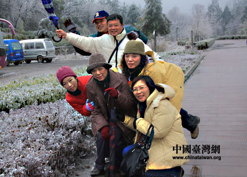 中國臺灣網2月28日消息 昨天,來湖南參訪的近40位臺南市地方民意代表、里長走進清溪潺潺、奇峰聳立的張家界旅游風景區,游覽黃龍洞和武陵源風景區,26日晚上,正值雨季的張家界適逢一場較大的雨雪,昨天武陵源內海拔稍高的地方出現了銀裝素裹的霧凇奇觀,引起來自寶島的客人驚嘆。