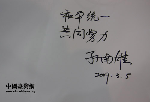 采訪結束后,孫南雄欣然在留言本上留言:和平統(tǒng)一、共同努力