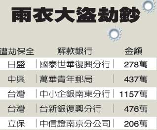 中國臺灣網3月7日消息 據臺灣媒體報道,臺北街頭6日再現“雨衣大盜”,搶走銀行278萬元新臺幣現鈔,警方從作案手法、特征分析,這是“雨衣大盜”八年來所犯第五件搶劫案。該事件也引起外界對于社會治安的疑慮,尤其歹徒多次在雨天作案得逞,更讓銀行和保安業者人人自危。