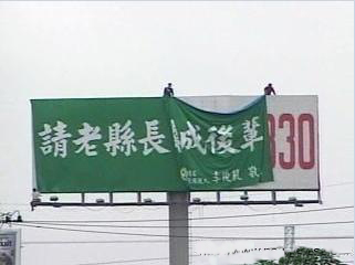 李俊毅刊登“請(qǐng)老縣長(zhǎng)(指陳唐山)牽成后輩”的戶外廣告 來源:臺(tái)灣“今日新聞”