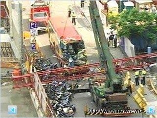 廣東旅客游覽車在臺(tái)北遭起重機(jī)吊臂砸中,2死1命危。來(lái)源:臺(tái)灣今日新聞