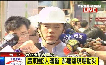 廣東旅客游覽車臺(tái)北遭起重機(jī)吊臂砸中,2死1命危。圖為臺(tái)北市長(zhǎng)郝龍斌赴現(xiàn)場(chǎng)勘察。來(lái)源:臺(tái)灣TVBS電視臺(tái)