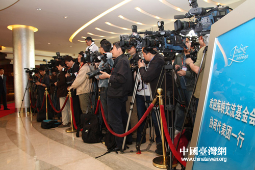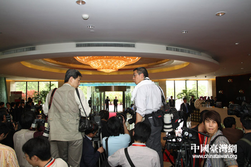 中國臺灣網4月25日南京消息 出席第三次“陳江會談”的海基會董事長江丙坤一行,預計將在今天上午11時50分左右抵達此次會談所在地——南京紫金山莊,海協會會長陳云林及相關人員將在紫金山莊主樓大堂迎接。 本次會談吸引了兩岸四地及海外的98家媒體260余名記者云集南京,圖為在紫金山莊主樓大堂駐守等待的媒體大軍。(記者 李徽 鐘寶華)