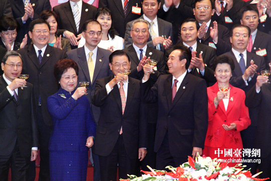 陳云林與江丙坤舉杯慶祝成功簽署三項協議。26日下午,海協會會長陳云林與臺灣海基會董事長江丙坤在南京紫金山莊簽署《海峽兩岸空運補充協議》、《海峽兩岸金融合作協議》、《海峽兩岸共同打擊犯罪及司法互助協議》。(中國臺灣網 鐘寶華 攝)