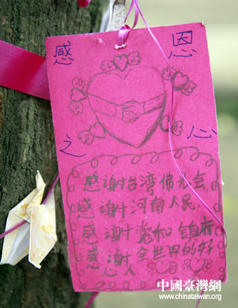 一走進彰明中學,兩岸記者就發現綠植上掛滿了各種卡片、千紙鶴等,仔細一看,發覺字里行間都是學生們親筆寫下的感謝與祝福。校長劉建雄告訴記者,這些都是學生們為表達對臺灣佛光會及對口援建省份河南等各地的愛心人士而精心制作,“5.12”地震1周年之際,學生們還將寫感謝信、感恩卡,在5月12日之前寄到臺灣國際佛光會總部,再表感謝。