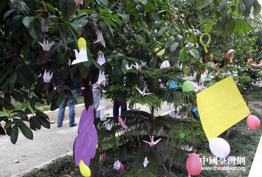 彰明中學學校的綠植上,掛滿了學生寫下的感恩與祝福。(中國臺灣網 鐘寶華 攝)