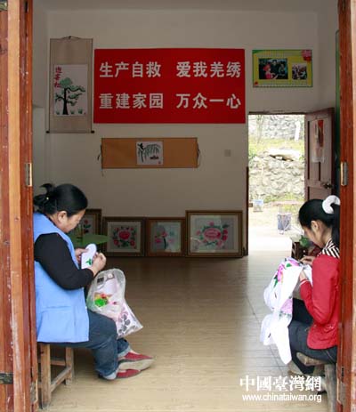 羌家女兒正在北川羌秀培訓(xùn)班里認(rèn)真刺繡。(中國臺灣網(wǎng) 鐘寶華 攝)
