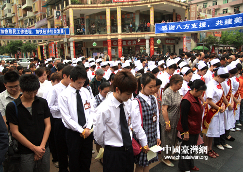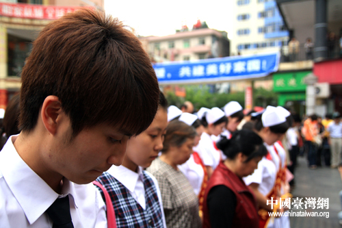 12日14時(shí)28分,四川雅安市民聚集在廣場(chǎng)為在“5·12”特大地震中遇難的同胞默哀。 (中國(guó)臺(tái)灣網(wǎng) 田云鵬 攝)