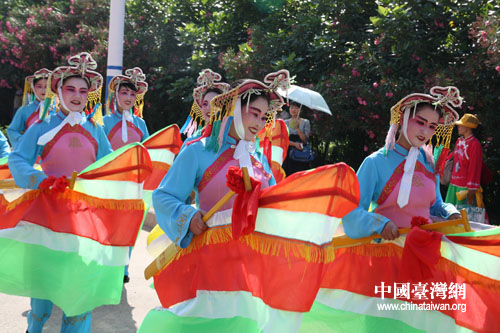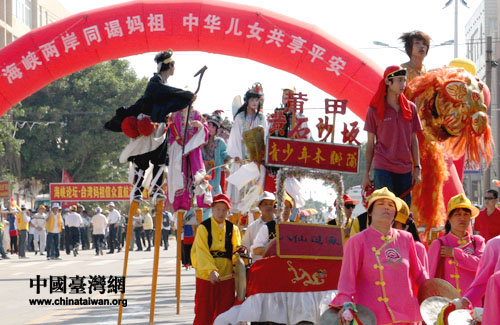 為歡迎臺(tái)灣媽祖信眾,湄洲民眾獻(xiàn)上精彩的民俗踩街表演。(中國(guó)臺(tái)灣網(wǎng)記者 張弛 攝)