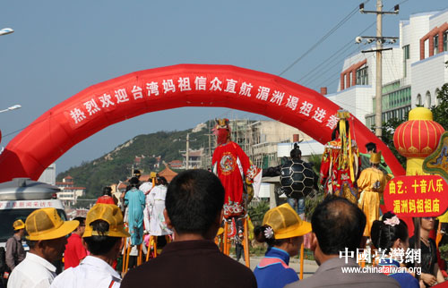 中國(guó)臺(tái)灣網(wǎng)5月15日莆田消息 臺(tái)灣媽祖信眾直航湄洲進(jìn)香團(tuán)今天下午抵達(dá)湄洲碼頭,湄洲當(dāng)?shù)孛癖娞匾猥I(xiàn)上精彩的民俗踩街表演,歡迎臺(tái)灣同胞的到來(lái)。(記者 張弛)