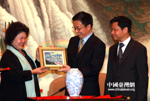 5月23日下午,上海市市長韓正在上海興國賓館會見了高雄市市長陳菊,陳菊向韓正贈送精美禮品。(中國臺灣網 田云鵬 攝)