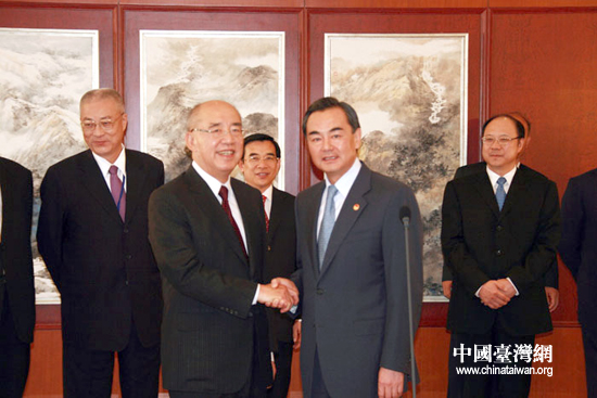 中國(guó)國(guó)民黨主席吳伯雄率領(lǐng)中國(guó)國(guó)民黨大陸訪問團(tuán)于25日11時(shí)5分許乘機(jī)抵達(dá)北京,開始訪問大陸行程。中共中央臺(tái)辦主任王毅到機(jī)場(chǎng)迎接。(中國(guó)臺(tái)灣網(wǎng) 鐘寶華 攝)