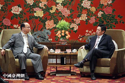 6月26日下午,北京市副市長丁向陽在京會見了臺灣中部四縣市負責人。丁向陽同臺中市市長胡志強交談。(中國臺灣網(wǎng) 鐘寶華 攝)
