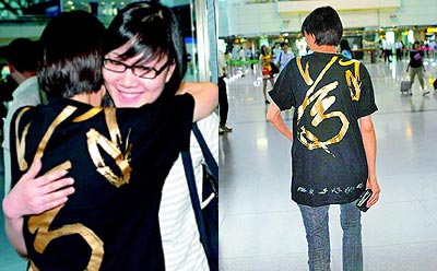 馬英九的妻子周美青昨天前往機場為小女兒馬元中送行,所穿紀念T恤今天引發(fā)臺灣民眾搶購。圖片來源:臺灣《聯(lián)合報》《蘋果日報》