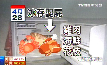 藏尸于冰箱之后,保姆全家還陸續(xù)從冷凍庫拿出雞肉、海鮮,還有烏魚等食品,煮熟食用。(圖片來源:臺灣TVBS電視臺)