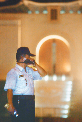 臺北中正紀念堂管理處今天將拆除“灣民主紀念館”匾,為防止意外發(fā)生,警察昨天入夜后即站崗待命,并凈空自由廣場內的民眾。(圖片來源:臺灣《聯(lián)合報》)