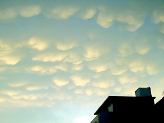 中國臺灣網7月21日消息 據臺灣《聯合報》報道,澎湖上空前天傍晚出現“乳房狀云”,一個個罩杯形狀的云朵掛在天空,人人稱奇。氣象站主任許天生說,可能是“莫拉菲”臺風過后,下降氣流遇冷空氣凝結,又有暖氣流往上升,冷暖空氣相遇強烈波動凝結成的沉積云。(云鵬)