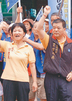 桃園縣議長曾忠義昨天率支持者到縣黨部完成初選登記,眾人在門前高呼口號。(圖片來源:臺灣《聯合報》)