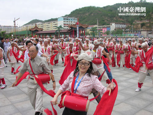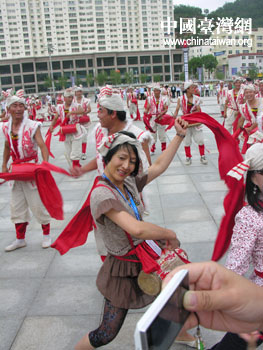 臺(tái)北藝術(shù)大學(xué)舞蹈系主任鄭淑姬與腰鼓手合影留念 (中國臺(tái)灣網(wǎng) 蕪?fù)?攝)