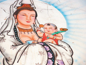 臺灣新竹縣惠昌宮墻上彩繪的“觀音送子圖”,觀世音被畫成爆乳,文史工作者批“不倫不類”,廟方挺創作者,表示沒有人反映不妥。(圖片來源:臺灣《聯合報》)