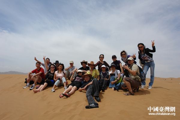 7月24日,來自海峽兩岸媒體的記者們在寧夏中衛市沙坡頭景區合影留念。(中國臺灣網 楊永青 攝)