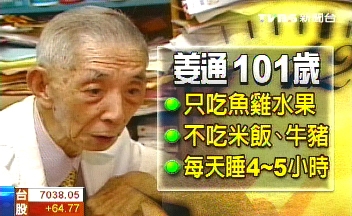 身為島內最高齡,而且還在看診的中醫師,姜通靠的是自創的另類養生法,他因為挑食,只吃魚肉、雞肉和大量水果,米飯,牛肉、豬肉都不吃,每天睡眠4到5小時,喝6大杯牛奶,背脊、腰桿卻能挺得跟年輕人一樣直。