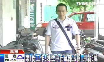 據(jù)臺灣TVBS電視臺報道,穿著輕便走進民進黨高雄市黨部的陳致中,從8月開始就要領(lǐng)薪水,擔任黨部的法律咨詢顧問,這也是他從學校畢業(yè)之后,第一份有薪水的工作。