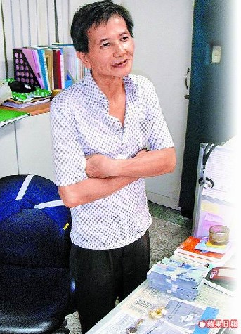 賴錦森被搶走400萬元新臺幣,到警局看到只剩65萬元現金,無奈地抱胸搖頭。圖片來源:臺灣《蘋果日報》