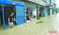 高雄縣梓官鄉淹水,市場攤販仍硬著頭皮擺攤,表情無奈。來源:臺灣《蘋果日報》