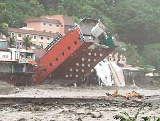 昨天中午11時(shí)38分,有22年歷史的金帥飯店,不敵激濁的山洪,在對(duì)岸圍觀群眾驚叫聲中,瞬間倒入知本溪中,附近十棟民宅與商店也被沖走;海岸山脈另一頭的紅葉溫泉全部被埋在泥石流里。