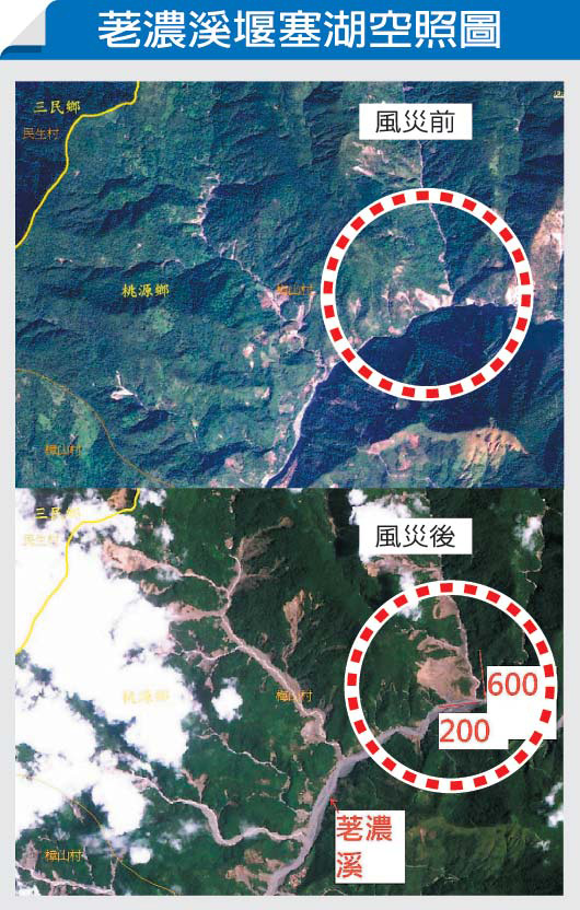 荖濃溪近玉山上游處土石堆積成湖,原本寬僅二三十米的河道,災后寬100米,最大片的堰塞湖所淤積的土石寬200米,長600米。如果再下雨會造成新的泥石流,下游的寶來村已經很脆弱受不了再次侵襲。(圖片來源:臺灣聯合新聞網)