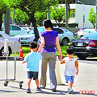 陳幸妤昨下午牽著兩個小兒子,接大兒子趙翊安放學回家。來源:臺灣《蘋果日報》