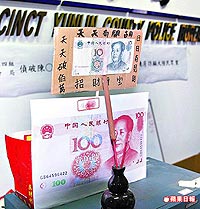 中國臺灣網9月2日消息 一群原從事特種行業的臺灣年輕男女,因景氣欠佳,酒店生意不好,集體轉行從事詐騙業,專門騙大陸民眾,日前詐騙一名精明的臺商遭識破,臺商打反詐騙電話報警。臺灣警方昨攻堅時發現嫌犯竟將人民幣影印放大,上香膜拜,就連電腦屏幕桌面也是人民幣圖像,不禁笑罵:“真是想錢想瘋了!”