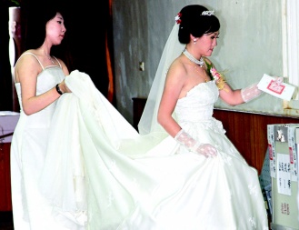 澎湖縣昨天舉行博弈公投,披著白紗的新娘也不放棄投下寶貴一票,公投結(jié)果反賭勢力獲勝。(來源:臺灣《聯(lián)合報》)