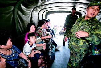“芭瑪”臺風威脅下,高雄縣六龜鄉寶來村民昨天全部撤離,老老少少搭乘軍車下山。來源:臺灣《聯合報》