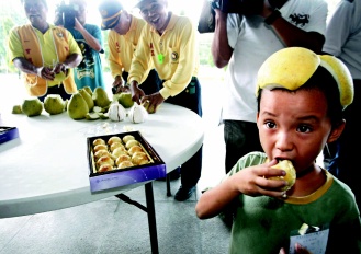 中秋節還是要過的,一貫道天臺山道場為撤離家園的民眾,準備了月餅跟柚子,小朋友戴起柚子帽。來源:臺灣《聯合報》