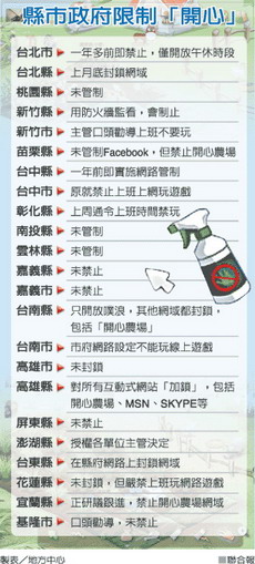 基隆市政府也已著手管制市政府網(wǎng)絡,完成計算機設定后即不得連上開心農(nóng)場。臺北縣政府上月28日起中斷與開心農(nóng)場聯(lián)機,停止與開心農(nóng)場聯(lián)機后,約減少1%網(wǎng)絡流量,員工抱怨這是小題大作。(芮文輝)