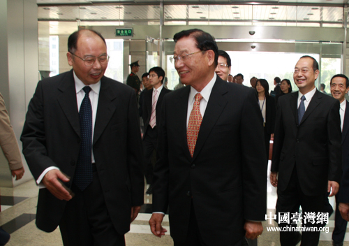中國臺灣網10月29日北京消息 29日,臺灣海基會董事長江丙坤率領的海基會新聞交流團一行訪問人民日報社。這是人民日報社社長張研農迎接江丙坤一行的到來。(中國臺灣網 田云鵬 攝)