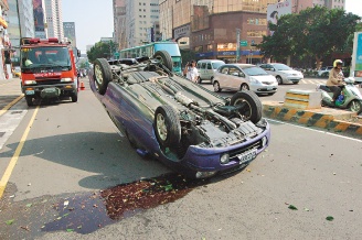 強風發(fā)威,連市區(qū)也躲不過風災。臺中市昨天吹起八級強風,兩名比丘尼的轎車來不及開到慢車道避風,車子被吹得四輪朝天,人也受傷送醫(yī);苗栗銅鑼外環(huán)道一座20噸重T壩,被強風吹倒,險些砸到人。