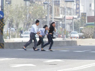 臺中縣海線地區(qū)昨天東北季風強勁,行人相互攙扶過馬路,以免被吹倒。來源:臺灣《聯(lián)合報》