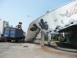 梧棲鎮(zhèn)中棲路一家歇業(yè)的釣蝦場招牌,昨天中午也被強風吹落,整片長達20多米,所幸沒有人傷亡,業(yè)者趕緊請來工人以乙炔切開,再以大貨車運走。