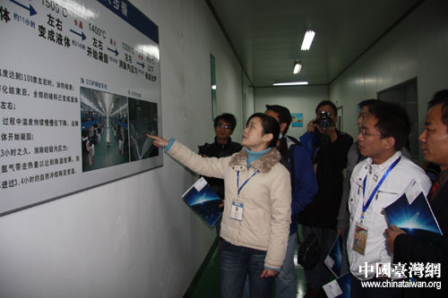 17日下午,第六屆中國網絡媒體江西行采訪團一行在位于新余市的江西賽維LDK太陽能高科技公司參訪,圖為工作人員向媒體工作者講解工藝流程。(中國臺灣網 高大林 攝)