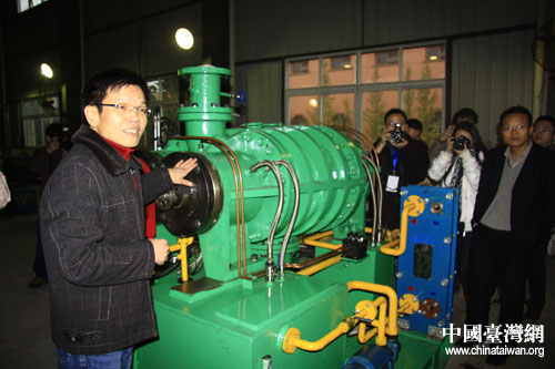 17日下午,第六屆中國網絡媒體江西行采訪團一行在位于新余市的江西華電電力公司參訪,圖為工作人員向媒體工作者講解螺桿膨脹動力機。(中國臺灣網 高大林 攝)