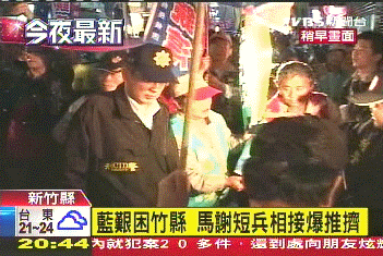 據(jù)臺灣TVBS電視臺報道,馬英九、謝長廷,各自帶著候選人掃街,沒想到半路上,狹路相逢,爆發(fā)沖突。綠營支持者不滿員警為了元首維安,在馬路上拿盾牌筑人墻,不讓拜票隊伍經(jīng)過,情緒爆發(fā)。他們對著馬英九高喊:“為什么不能過去?為什么不能過?”混亂中還有人動手拉扯候選人旗幟,場面更加混亂。