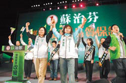 蘇治芬萬人造勢會,主席蔡英文(左)聯手為該黨“三合一”候選人輔選。圖片來源:臺灣《中國時報》