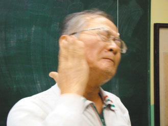 嘉義縣民進黨員蔡豐文昨天在翁重鈞記者會上,自打三個耳光,懲罰自己八年支持陳水扁及陳明文。圖片來源:臺灣《聯合報》