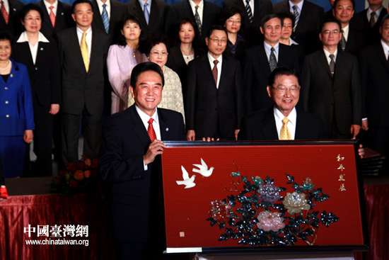 中國(guó)臺(tái)灣網(wǎng)12月22日臺(tái)中消息 22日下午,海協(xié)會(huì)會(huì)長(zhǎng)陳云林向臺(tái)灣海基會(huì)董事長(zhǎng)江丙坤贈(zèng)送揚(yáng)州漆器《和平發(fā)展》。當(dāng)天下午,兩岸兩會(huì)領(lǐng)導(dǎo)人在臺(tái)中市簽署了《海峽兩岸漁船船員勞務(wù)合作協(xié)議》等三項(xiàng)協(xié)議。(中國(guó)臺(tái)灣網(wǎng) 李徽 攝)
