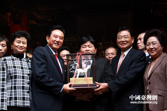 臺灣大甲鎮瀾宮院長顏清標向陳云林贈送錫雕《福祿壽喜》。 (中國臺灣網 李徽 攝)