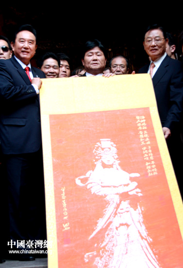 陳云林回贈顏清標一幅媽祖畫像。 (中國臺灣網 李徽 攝)